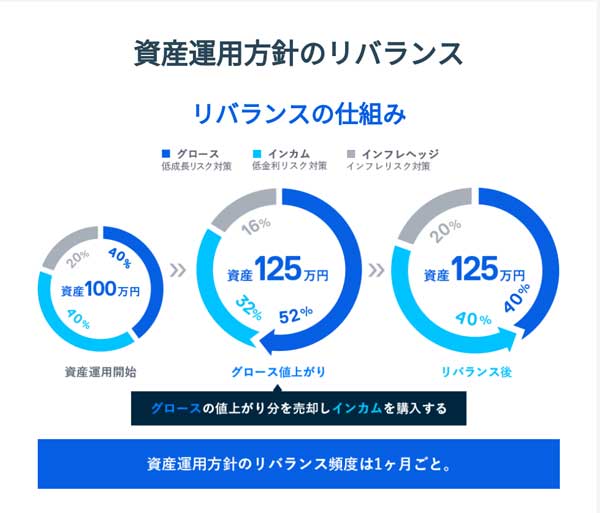 またTHEOはポートフォリオのリバランス(配分の見直し)を毎月行っており、例えば「グロース45%/インカム35%/インフレッジ20%」のポートフォリオを組んでいても、株価の上下、増資(毎月の積立)で必ずポートフォリオの比率が崩れてくるので(グロース50%/インカム40%/インフレッジ10%などになる)、基本的に毎月第一営業日に自動リバランスをして元のポートフォリオの比率に戻してくれます。