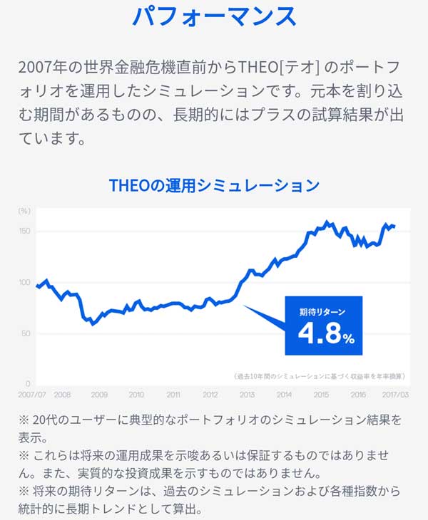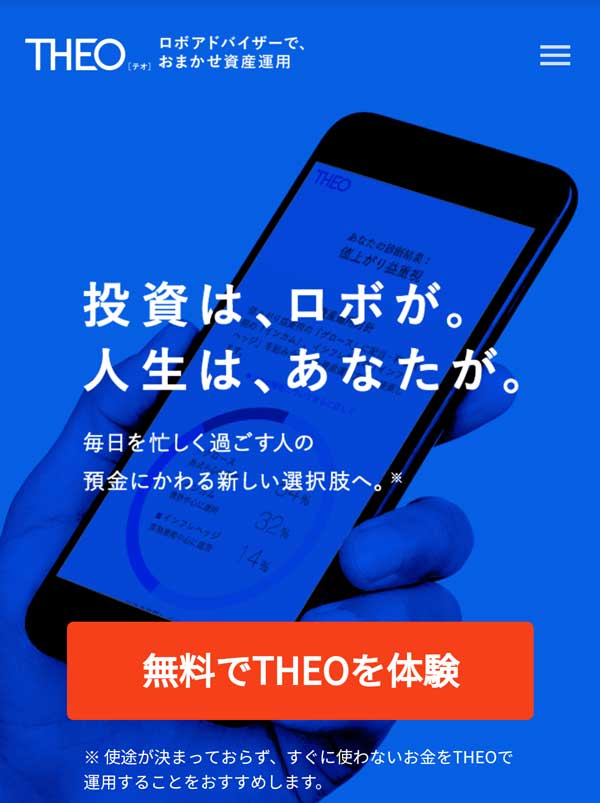 THEO[テオ]などのロボアドバイザーだけでなく、株、投資信託、不動産、ゴールド、原油など全ての投資は元本割れのリスクがあります。