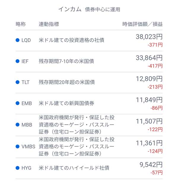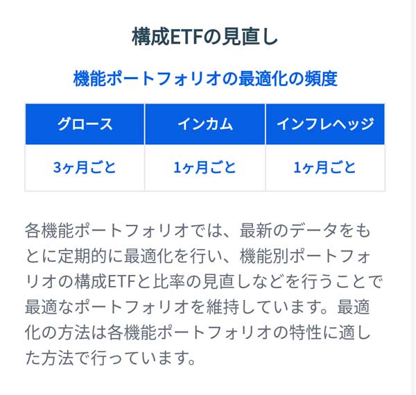もちろんポートフォリオ内のETF銘柄も「グロース⇒3カ月に1回/インカム⇒1カ月に1回/インフレッジ⇒1カ月に1回」と、定期的に見直しされています。