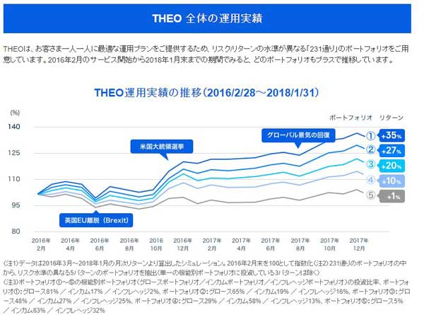 つまりポートフォリオごとに購入するETF(上場投資信託)が異なり、THEOが投資対象にしている株、債券、コモディティ(原油・ゴールドなど)、不動産(リート)など主にアメリカ市場で上場している30種類以上のETFの組み合わせで231種類の運用プランができあがります。