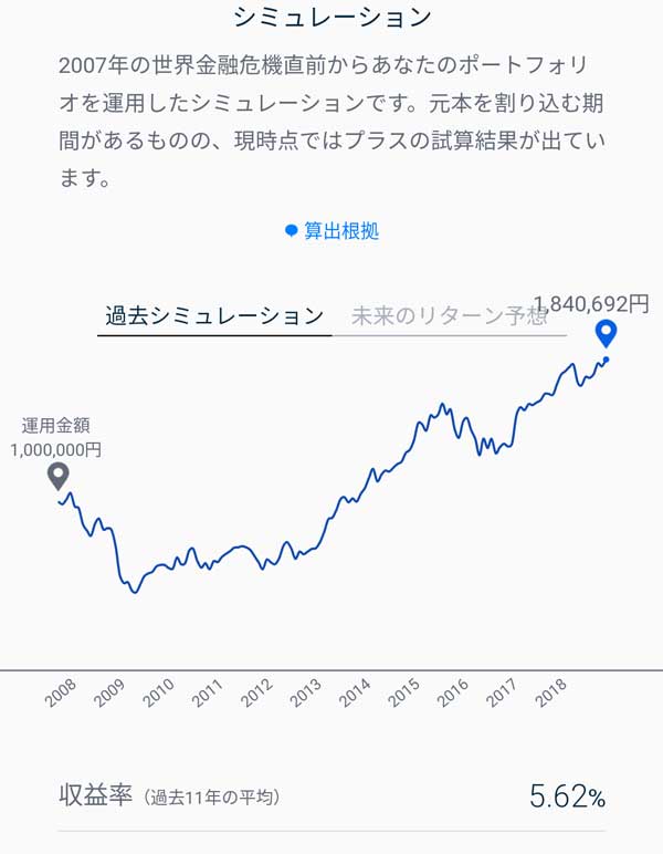 このポートフォリオで2007年から11年間、運用していた場合、100万円⇒184万円(税引後は約167万円)、20.315%税引後の年利は5.62%になっていたという過去のシミュレーションです。