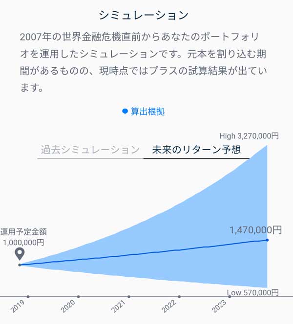 また自分のポートフォリオで運用した場合、過去どれほどの運用成績をあげることができたのか?また未来はどれほどのリターンを得ることができるのかのシミュレーション予想を見ることができます。