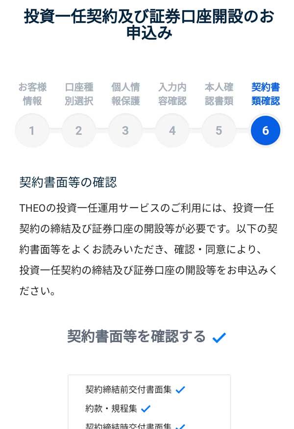 THEO登録完了後はTHEOにログインし(口座開設申し込み画面に移行する)、「名前・住所・電話番号・性別・生年月日・職業・投資経験」などを入力(選択)し口座種別の選択をし(原則確定申告不要な特定口座がおすすめ)個人情報保護の確認などを読んでチェックしていき本人確認書類をWEBからアップロードすれば口座開設申込みが完了です!