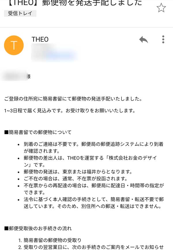 THEOから簡易書類が届きました(本人確認完了)