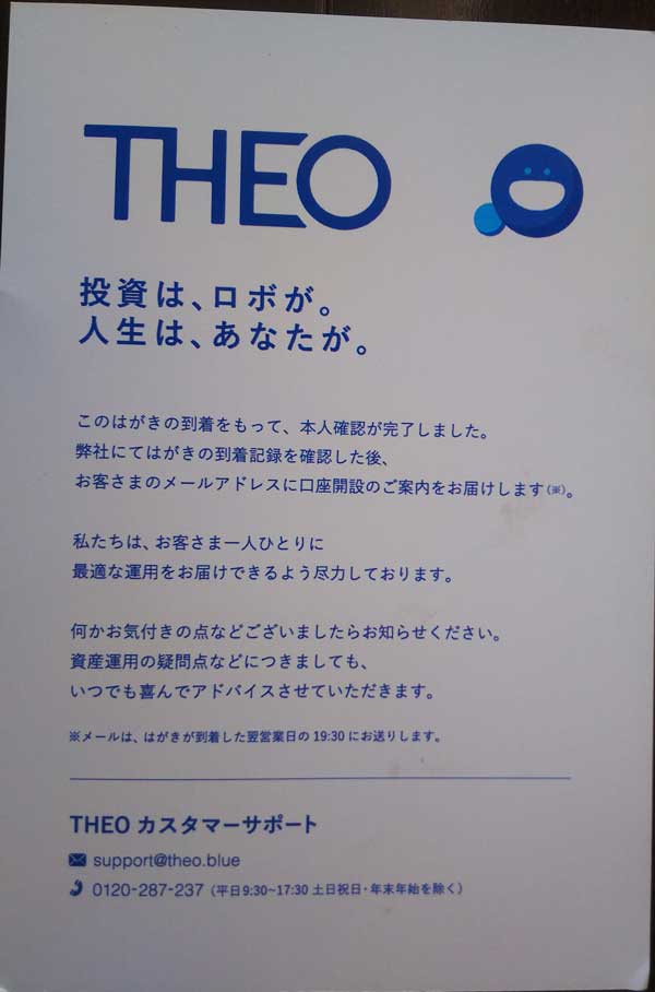 2018年10月16日(火)の午後2時くらいにTHEO[テオ]公式サイトから口座開設をスマホから申込み、10月18日(木)に簡易書類発送メールが来て、10月20日(土)に本人確認のための簡易ハガキが自宅に届き、10月21日(日)に口座開設完了メールが届きました。