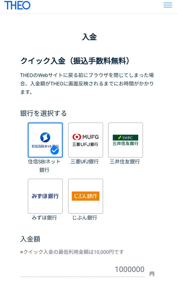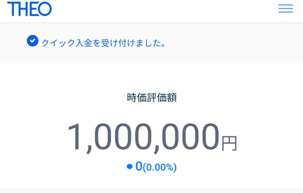 10月23日(火)の午前中に住信SBIネット銀行からクイック入金で100万円をTHEOの口座に入金しました。THEOに入金するだけで運用が開始します(ETFの買付が始まります)。