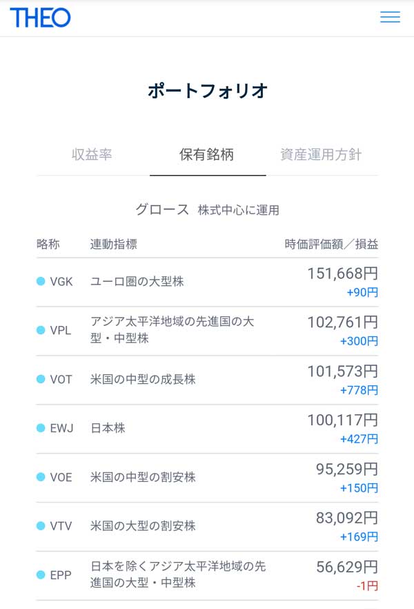 ちなみにTHEOでの最初のポートフォリオ(保有銘柄)は以下の通りです。