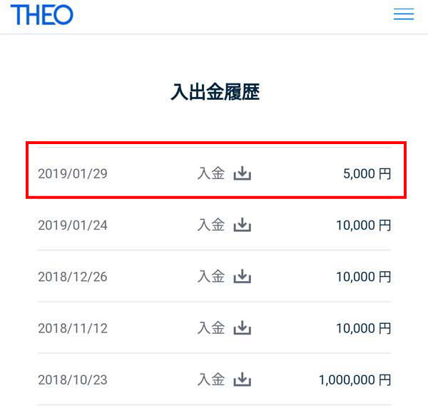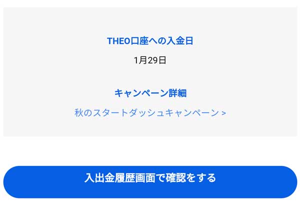 自動振替から3営業日後にTHEOの口座へ入金