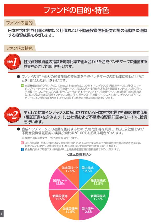 国内株式、先進国株式、新興国株式、国内債券、先進国債券、新興国債券、国内リート、先進国リート、8資産に均等(12.5%ずつ)に投資。 |