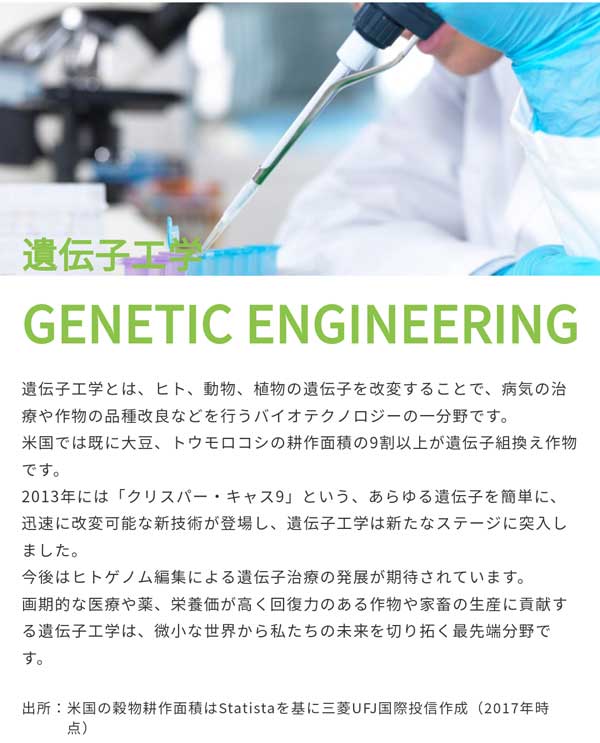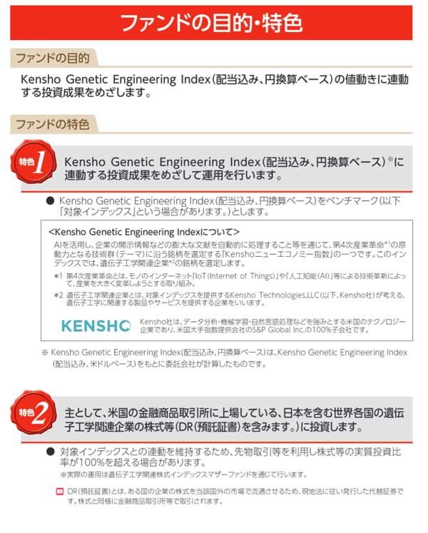 日本を含む世界各国の遺伝子工学関連企業の株式等の指数、Kensho Genetic Engineering Index(配当込み:円換算ベース)に連動 |