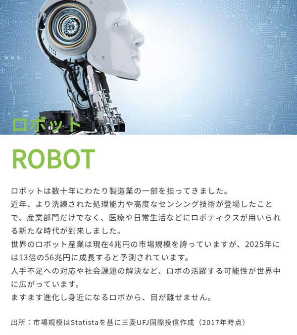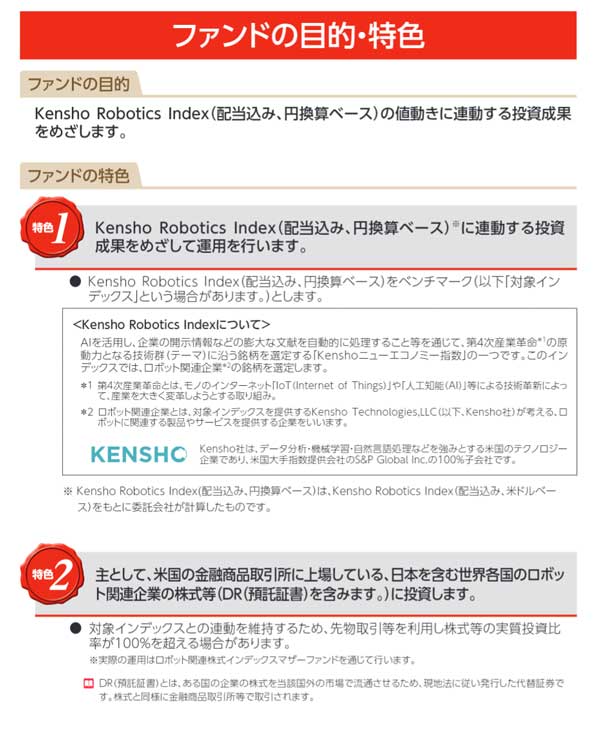 日本を含む世界各国のロボット関連企業の株式等の指数、Kensho Robotics Index(配当込み:円換算ベース)に連動 |