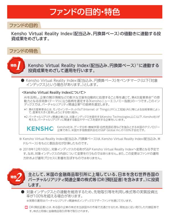 日本を含む世界各国の拡張現実・仮想現実関連企業の株式等に投資を行い、Kensho Virtual Reality Index(配当込み:円換算ベース)に連動 |