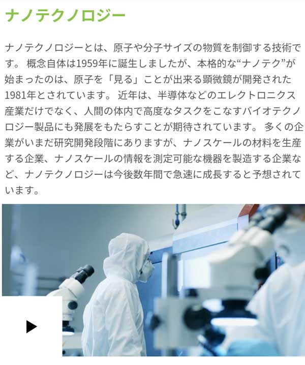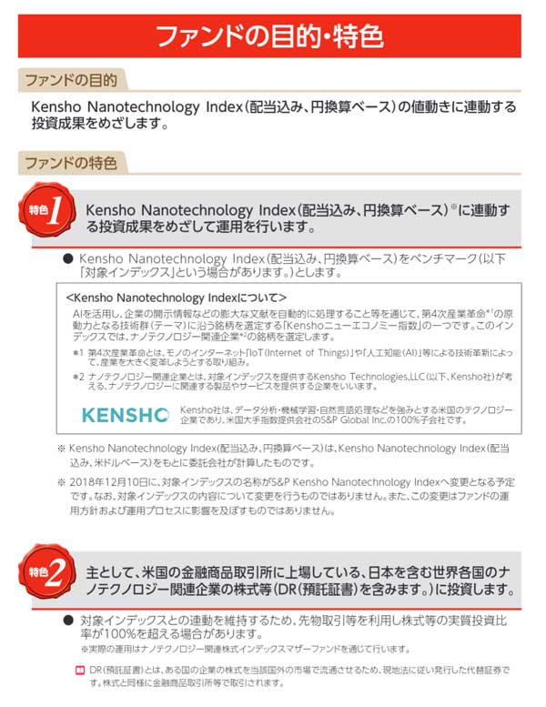 日本を含む世界各国のナノテクノロジー関連企業の株式等に投資を行い、Kensho Nanotechnology Index(配当込み:円換算ベース)に連動 |