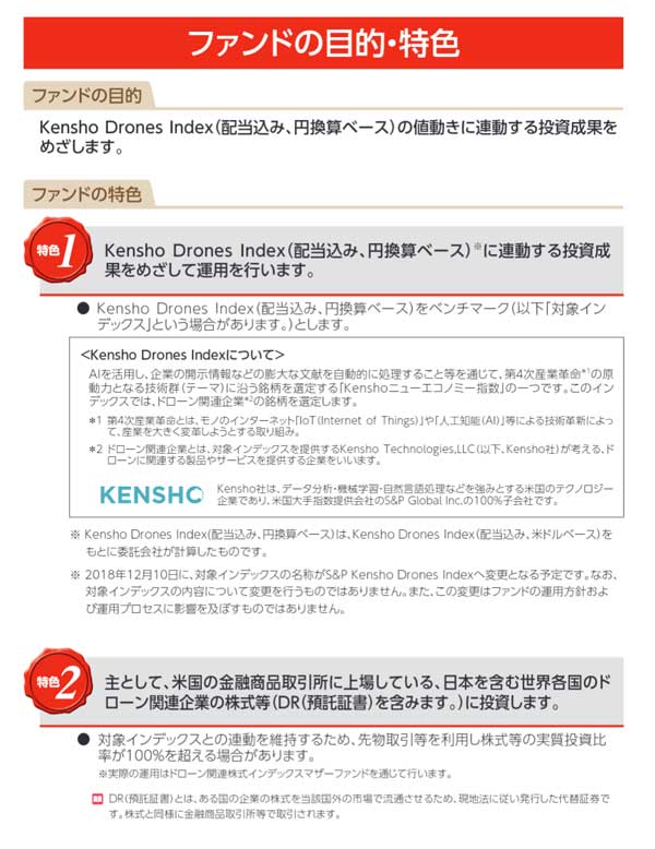日本を含む世界各国のドローン関連企業の株式等に投資を行い、Kensho Drones Index(配当込み:円換算ベース)に連動 |