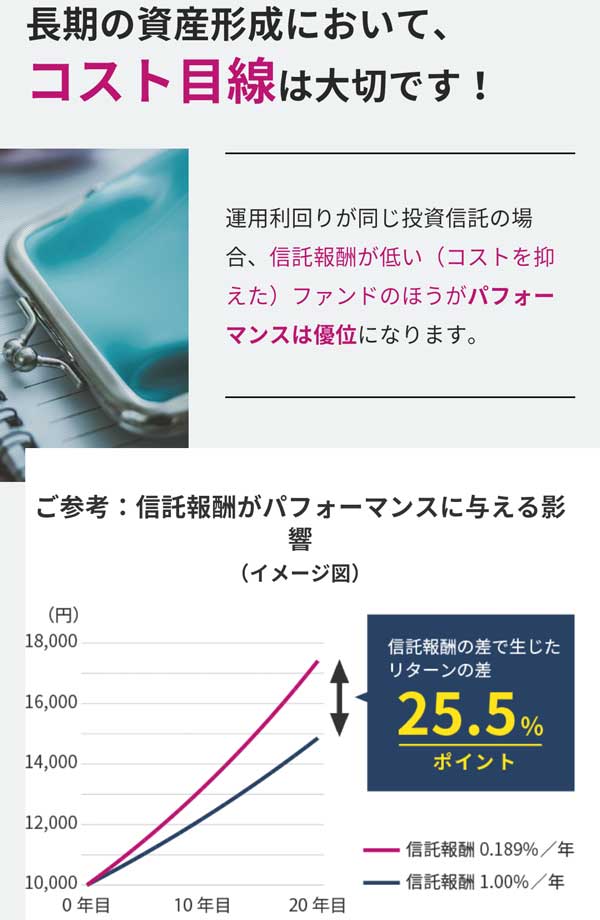 eMAXIS・Slim(イーマクシス・スリム)シリーズの最も大きな特徴が信託報酬率、つまり手数料(コスト)が安いことです。