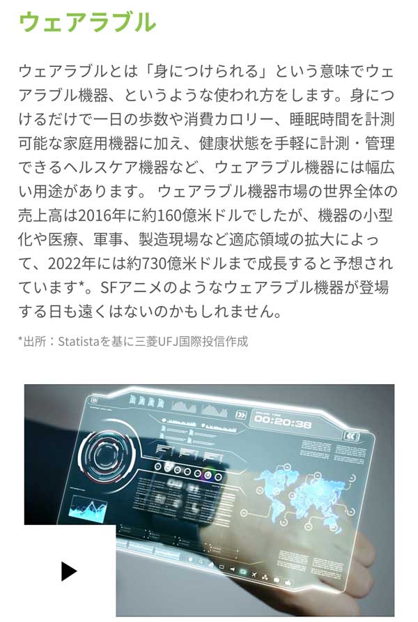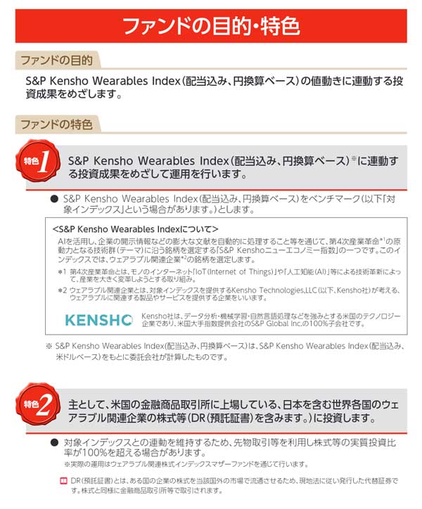 日本を含む世界各国のウェアラブル関連企業の株式等に投資を行い、S&P Kensho Wearables Index(配当込み:円換算ベース)に連動 |