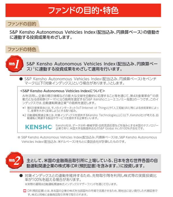 日本を含む世界各国の自動運転関連企業の株式等に投資を行い、S&P Kensho Autonomous Vehicles Index(配当込み:円換算ベース)に連動 |