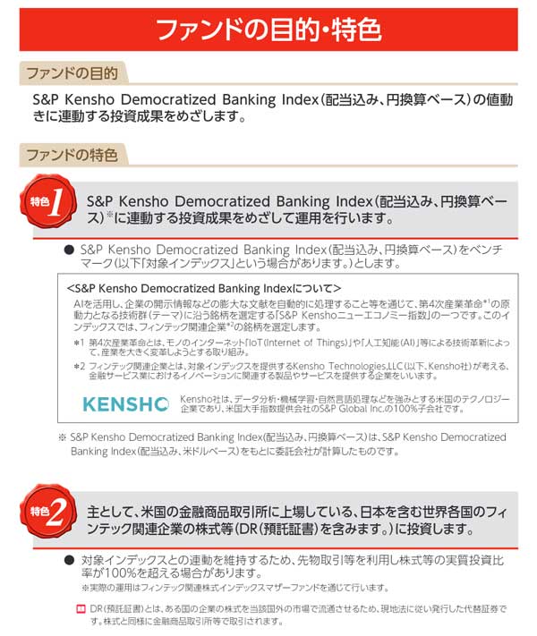 日本を含む世界各国のフィンテック関連企業の株式等に投資を行い、S&P Kensho Democratized Banking Index(配当込み:円換算ベース)に連動 |