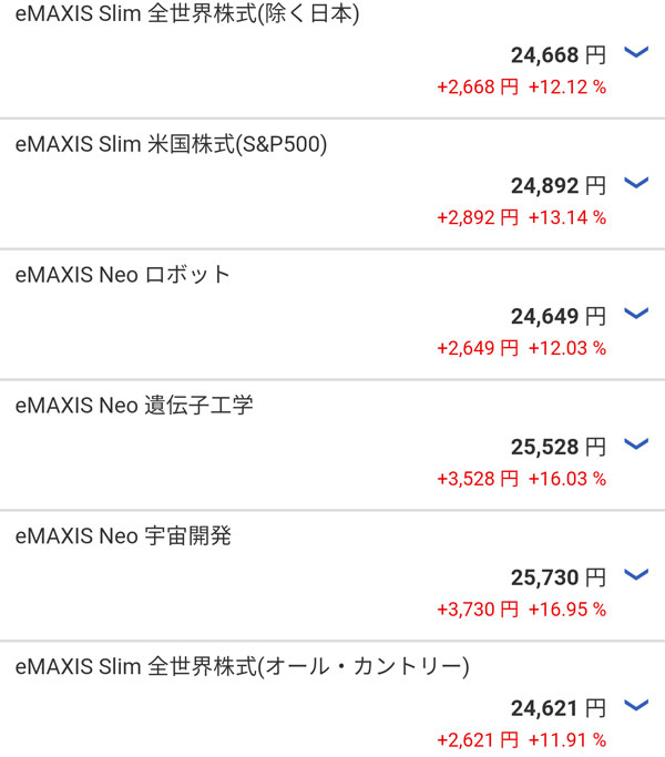 僕もeMAXIS(イーマクシス)シリーズの中でも特に手数料(コスト)が安くて人気のeMAXIS・Slim(イーマクシス・スリム)シリーズから8本、革新的なテーマ(遺伝子工学・ロボット・宇宙開発・バーチャルリアリティ・ナノテクノロジー・ドローン)の成長に期待するeMAXIS・Neo(イーマクシス・ネオ)シリーズから9本、計17本のeMAXISシリーズの積立投資をしてます( ̄▽ ̄)
