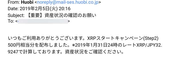 1,000円相当分のXRP(リップル)が貰えるスタートアップキャンペーンに間に合わなかったと思うのですが・・・、2019年2月5日(火)にHuobi(フォビ)から「XRPスタートキャンペーン(Step2)500円相当分を配布しました」のメールが来て、ログインしたら15.2XRP(Step2⇒500円相当)が付与されてました(^_^)