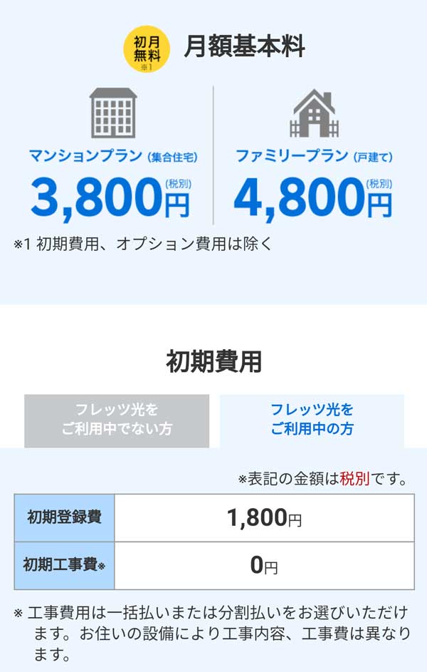 マンションプラン(集合住宅)⇒15,000円+税、ファミリープラン(戸建て)⇒18,000円+税ですが、初期工事費用(標準工事費用)は公式キャンペーンで無料でした。もちろん代理店経由で申込んでも無料です。