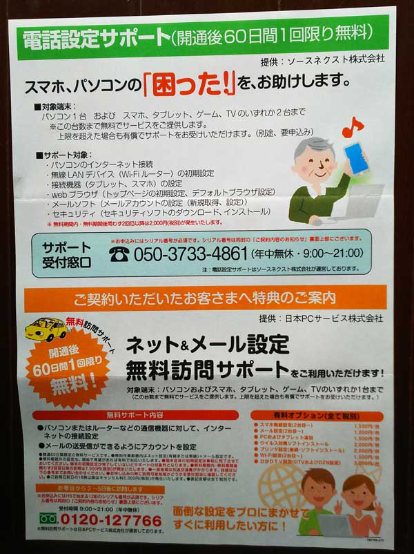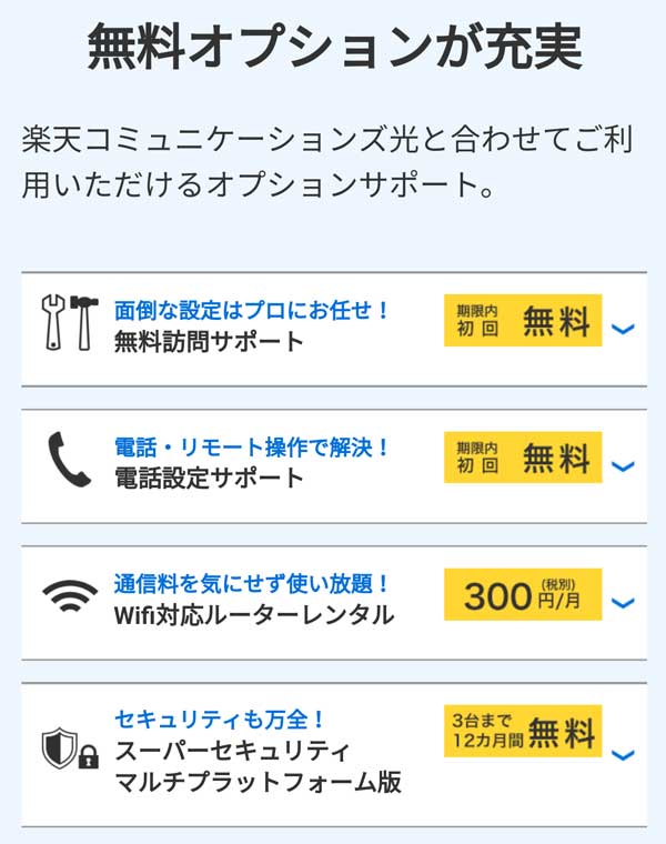 あと楽天ひかりは光回線開通後、60日以内に1回限りで電話サポート(2回目以降⇒2,000円)、訪問サポート(2回目以降⇒7,000円)が無料となっています。
