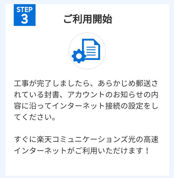 申し込み後、数日以内に電話連絡があり、申込内容の確認&開通工事の日時調整⇒ID、パスワードなどが記載された必要書類が届く⇒開通工事。