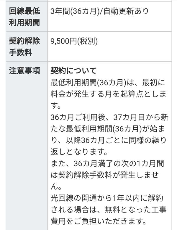 | 契約期間(回線最低利用期間) | 3年(36ヶ月) | ||||