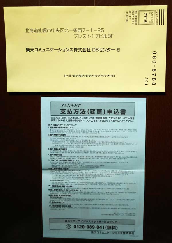 この時点で楽天ひかりの支払方法はまだ登録していないと思うので、支払方法(変更)申込書で銀行振替orクレジットカード払いどちらかを記入して返送します。