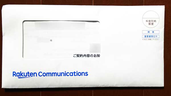 ④2019年2月7日(木)に楽天ひかりから書類(契約内容のお知らせ)が届く。
