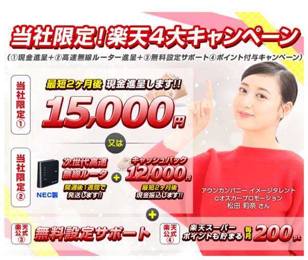 つまり公式サイト経由で楽天ひかりに申し込むと楽天スーパーポイント7,000ポイント+4,500円相当の無線LANルーター=約11,500円相当(新規、転用どっちも同じキャッシュバック)。