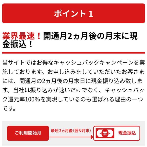 ・キャッシュバックが開通月の2ヶ月後末と早い