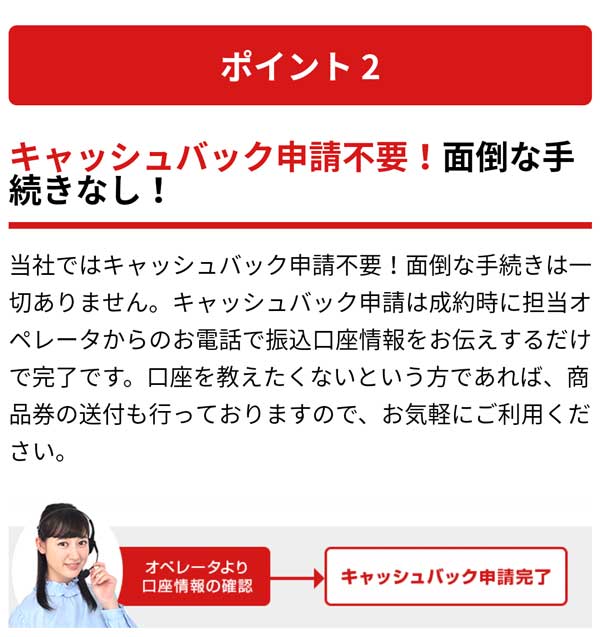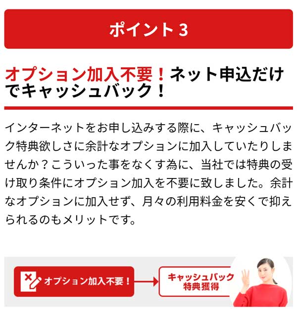 しかもWEBから申込みの場合、有料オプション付帯条件もないし、WEBから申し込み⇒電話確認連絡があるのでその際に口座情報を聞いてくるので口座情報を教えるだけで開通月の2ヶ月後月末(2月開通なら4月末)に2万円が振り込まれるだけなので、キャッシュバック申請を忘れる心配もないし、キャッシュバックが開通月の2ヶ月後と早い!