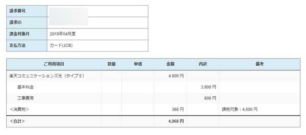 また工事費用も無料だったので、4月分は3,800円(マンションタイプ基本料金)+800円(工事費用⇒初期登録費用のこと)=4,968円(税込)でした。
