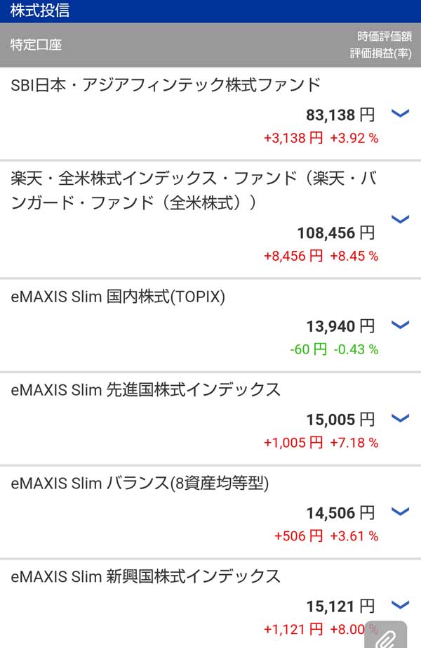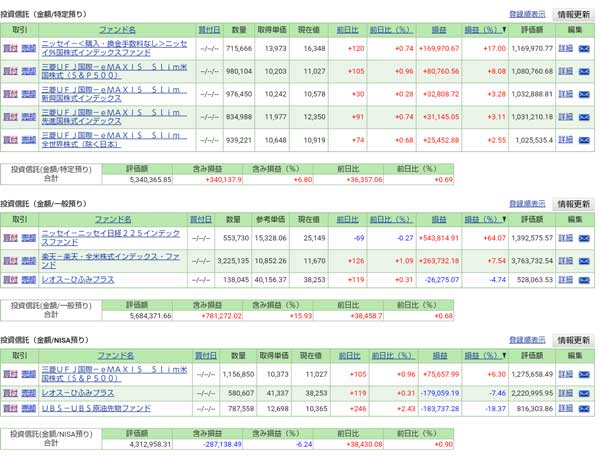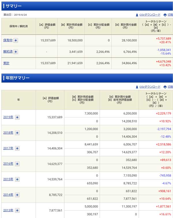 2013年からSBI証券で投資信託(インデックスファンド)の運用を始め、トータルリターン(保有中+解約済)は約+13%、約+460万です。