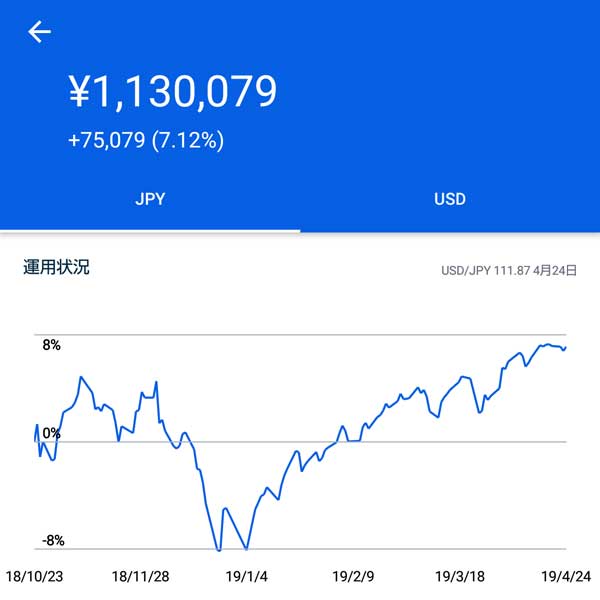 ロボアドは3つともリスク高めで運用してるので、2018年の年末にかけて大きくマイナスでしたが、2019年に入って急激に盛り返して3つともプラスに転じてます。