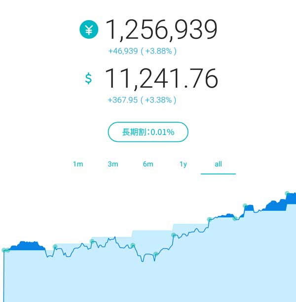 2019年に入ってリップル(XRP)に100万、NISAに120万(eMAXIS Slim 米国株式)、追加投資し、投信積立に44,000円、ロボアド積立に毎月5万円、投資してるので(毎月94,000円)、運用資産額が増えるのは当然ですが、やはりトータルリターンがプラスになると気分はいい(*´∇`*)