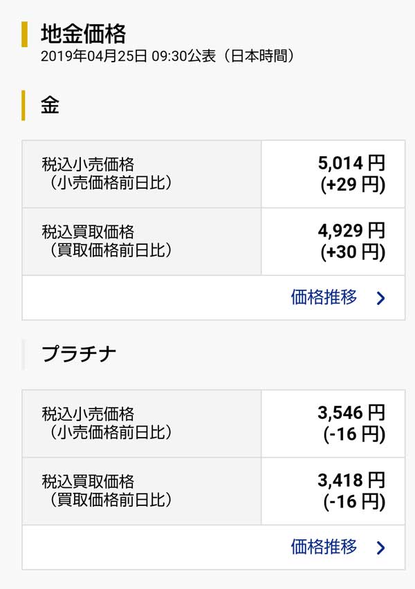 金(ゴールドバー)は2013年に、5,237円/1gのときに1kg=523万7千円で購入し、2019年4月25日の田中貴金属での税込買取価格が4,929円/1gなので、492万円。つまりマイナス31万円ほどです。