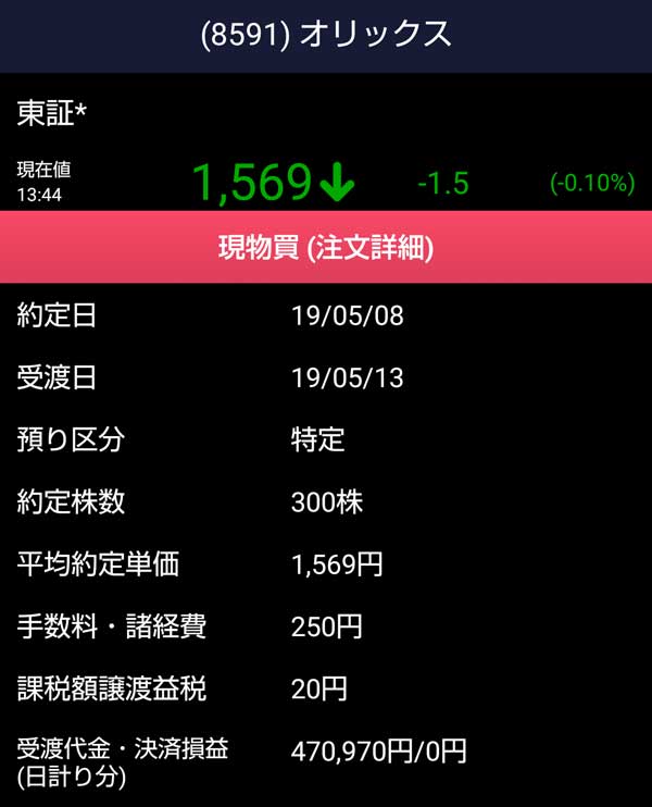 | 2019/5/8 | 300株 | 1,569円 | 470,970円 | ||