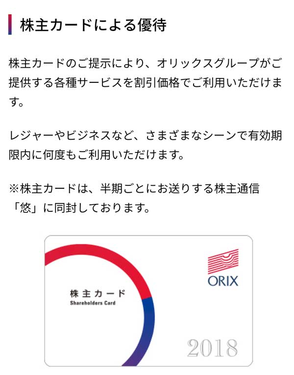また株主優待(ふるさと優待)とは別に、100株以上保有で年2回株主カードが発行され、株主カードを提示するとオリックスグループ(提携先)ホテル、旅館、レストラン等で様々な特典が受けられます。