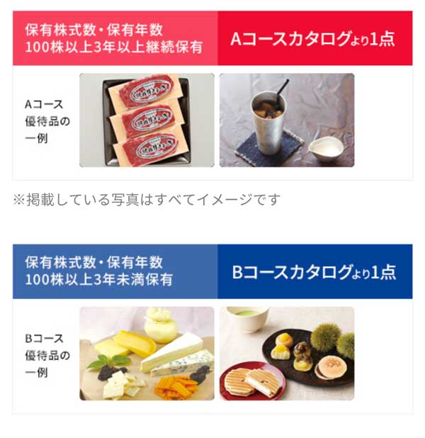 当然、保有株数に応じてもらえる配当が違いますが、株主優待(ふるさと優待・株主カード)は100株以上の株主全て同じ特典となっており(100株でも1000株でも一緒)、保有期間が3年未満or3年以上で貰えるカタログギフトが異なるだけです(つまり株主優待目的なら100株でOK)。