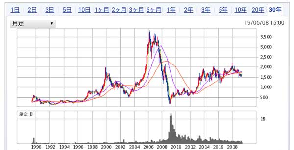 2006年4月に3,600円を付けたオリックス(株)ですが、リーマンショック後の2009年2月には200円と、わずか3年で約1/18まで株価が下落しました(;∀;)