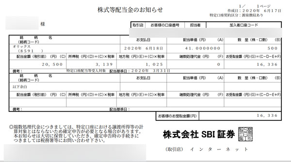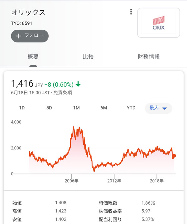 オリックス(8591)は2019年に600株購入し(平均約定単価:1,591円)、2020年6月18日の終値が1,416円だから評価損益は-11%(約-10万)。