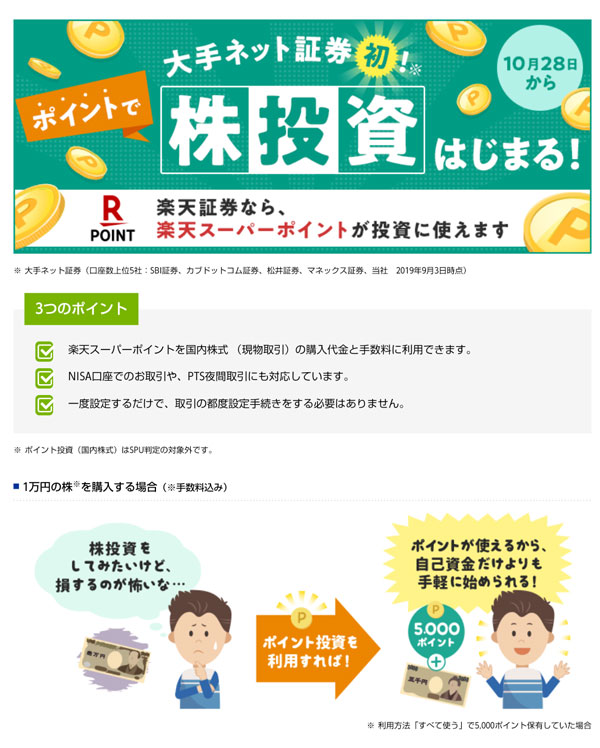 すでに楽天証券×楽天市場では楽天スーパーポイントで投資信託が買えるサービスを行っており、今回、国内株(国内ETF)が買えるサービスも内容はほぼ同じです。