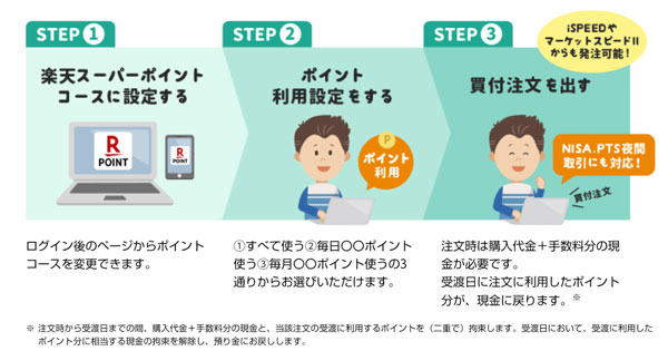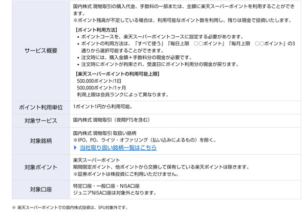 楽天スーパーポイントで国内株が購入できるサービス概要は以下の通りです。