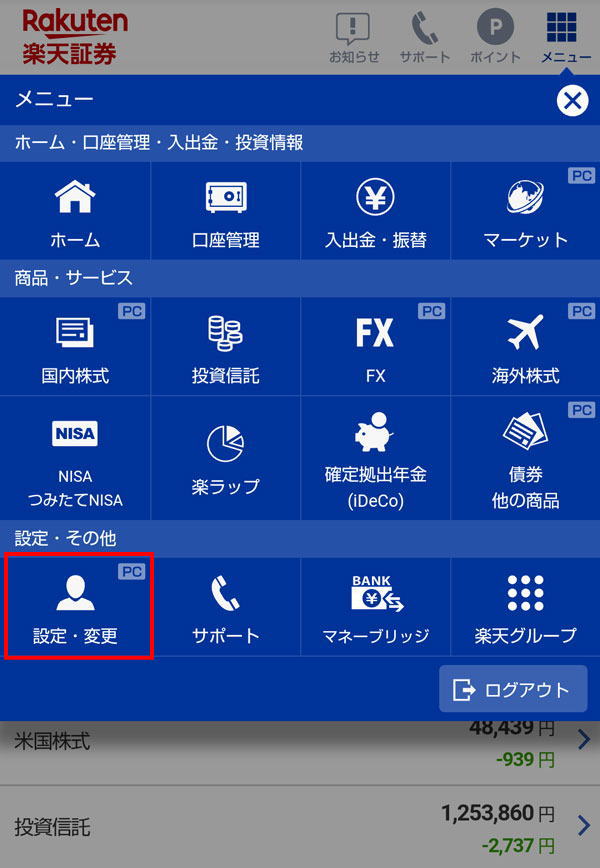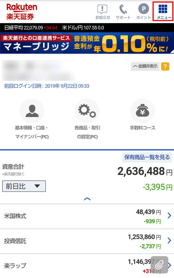 ①楽天証券にログイン⇒右上のメニュー(スマホの場合)