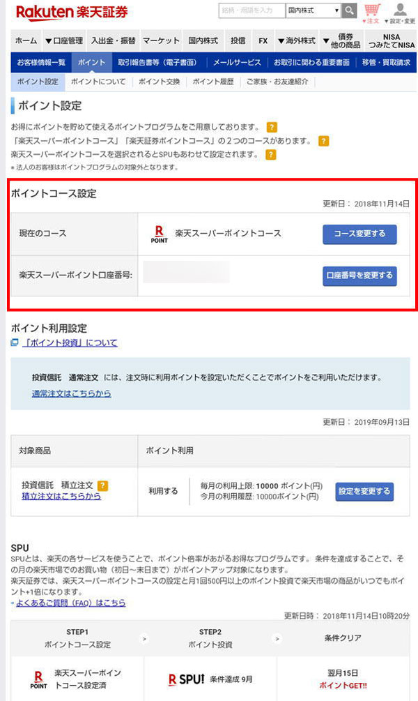 すでに楽天スーパーポイントで投資信託を買ってる人は「楽天スーパーポイントコース」になってると思いますが、初期設定の楽天証券ポイントコースになってる人はここで設定変更しましょう。