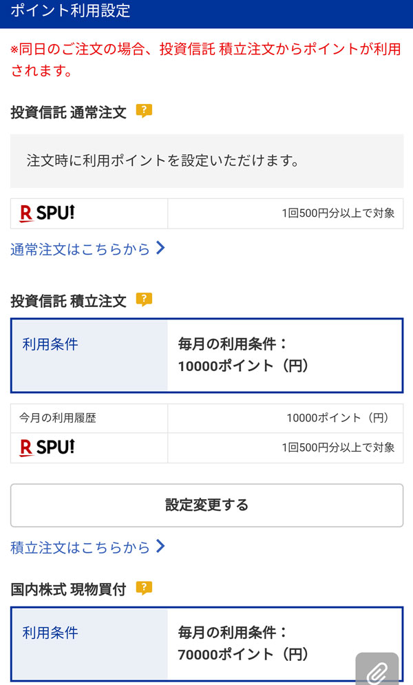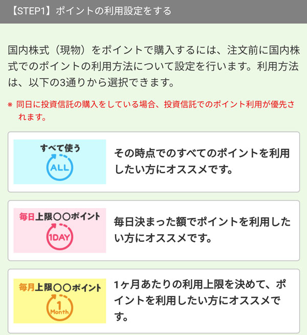 | ポイント利用設定 | 投資信託とは別に設定が必要 | ||||