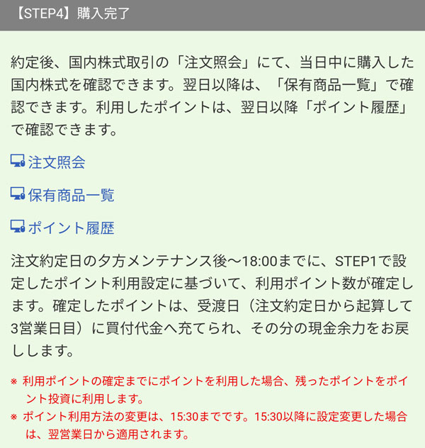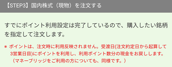 楽天スーパーポイントを使って投資信託を買う場合は注文画面で「ポイント利用数(一部使う/すべて使う/使わない)」から選択可能ですが(利用ポイントは即時反映)、国内株の場合は注文画面で楽天スーパーポイント利用の項目はなく、まずは現金(買付可能額)で買付、約定日から3営業日目にポイント利用設定したポイント分の現金が戻ってきます。