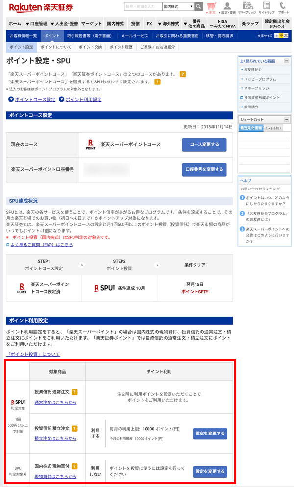 すでに楽天スーパーポイントを使って投資信託を買ってる人は楽天スーパーポイントコースに設定&ポイント利用設定してると思うけど、楽天スーパーポイントを使って国内株を買う場合、投資信託のポイント利用設定とは別に国内株のポイント利用設定もしないといけません。